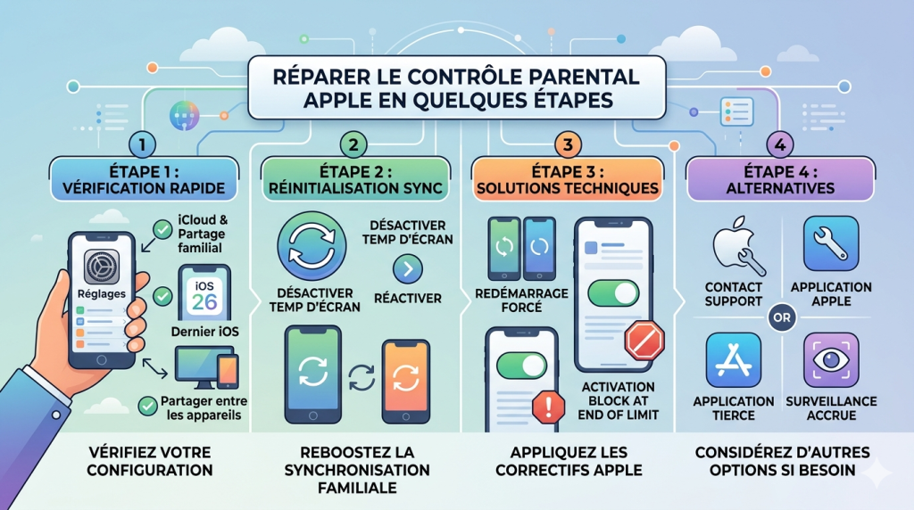 Le contrôle parental Apple n’est pas toujours cassé de A à Z. Dans la majorité des cas, il s’agit d’un mélange de bugs persistants et de réglages qui ne se synchronisent pas correctement.